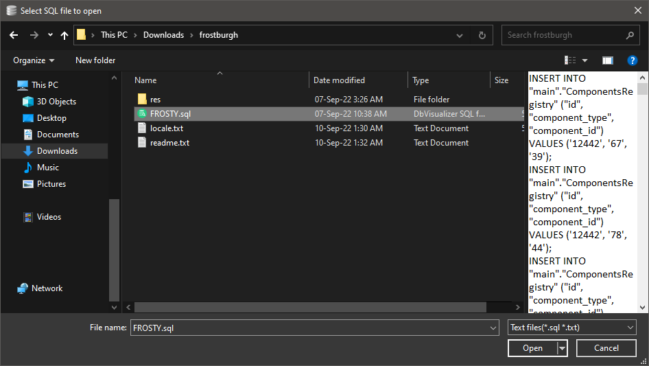 "FROSTY.sql" will have loaded and now you should be seeing this.